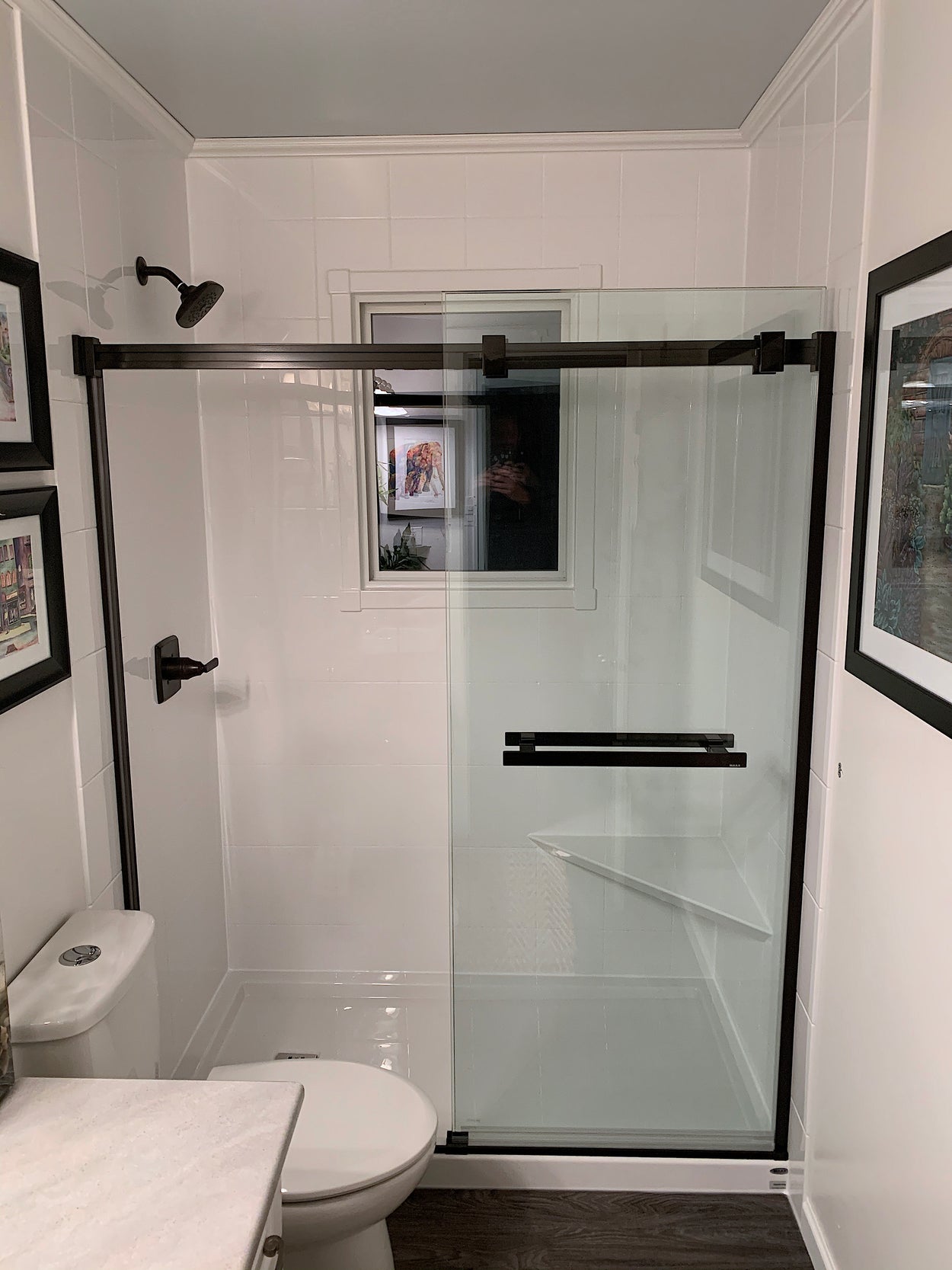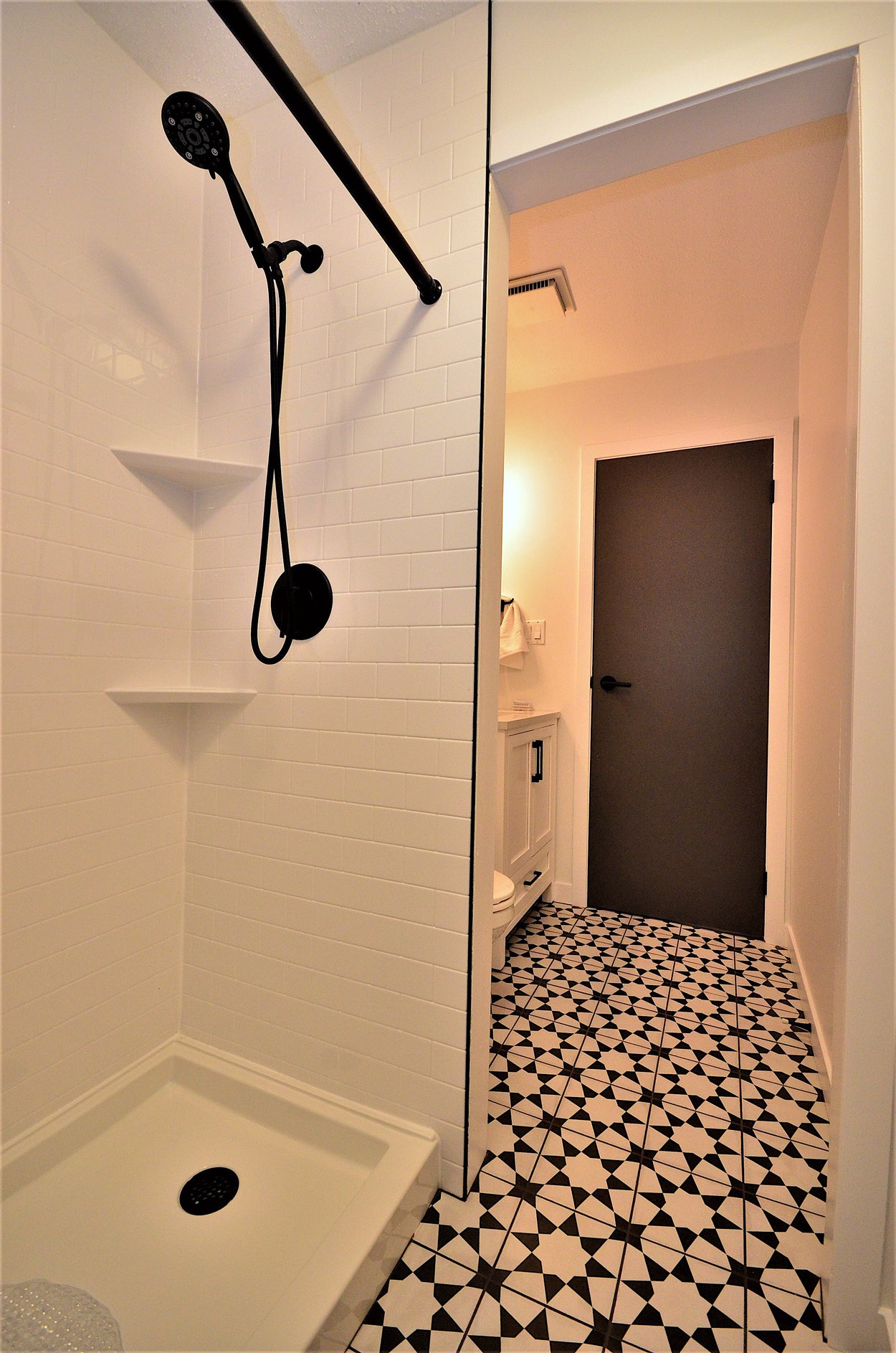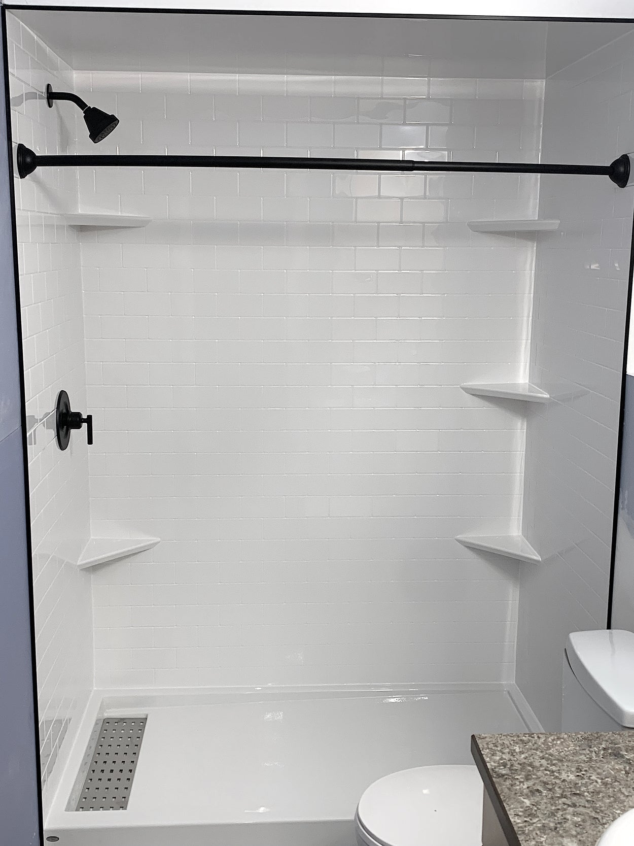 Full size shower. This size will fit where a regular size bathtub would. This shower can replace your existing bathtub. Most popular style currently is subway tile walls with matte black trims. This package is also available in brushed nickel or chrome. A shower is great alternative to a bathtub if you just prefer showers or you would like to replace your tub for accessibility reasons. This package looks sharp, clean, new and modern.